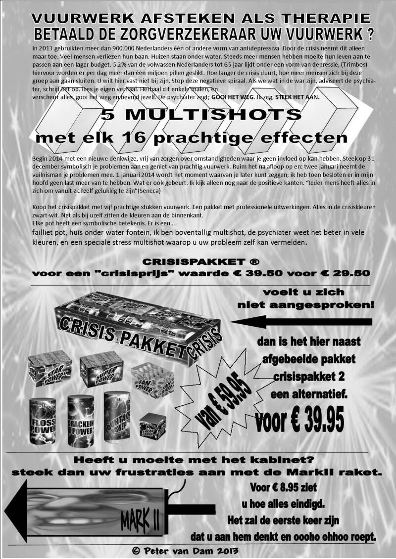 Om het voor mensen met een smalle beurs mogelijk te maken ook hier aan mee te doen, verkoopt hij een vuurwerkfontein met de keus uit diverse opschriften. Ook zijn er blanco stickers voorhanden waarop men zelf het eigen probleem kan vermelden.