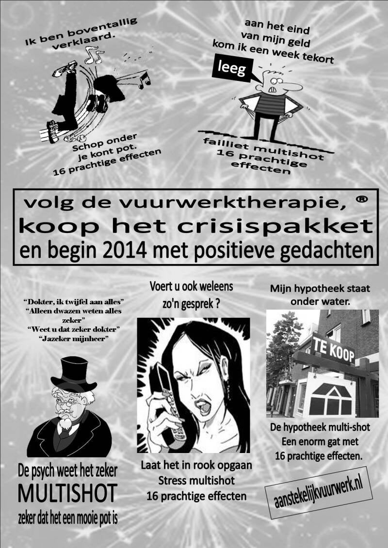 Om deze mensen waar er veel van zijn, te kunnen bereiken heeft hij een vuurwerkpakket ontwikkelt. "crisispakket" Dit pakket bestaat uit 5 potten met elk een symbolische betekenis.